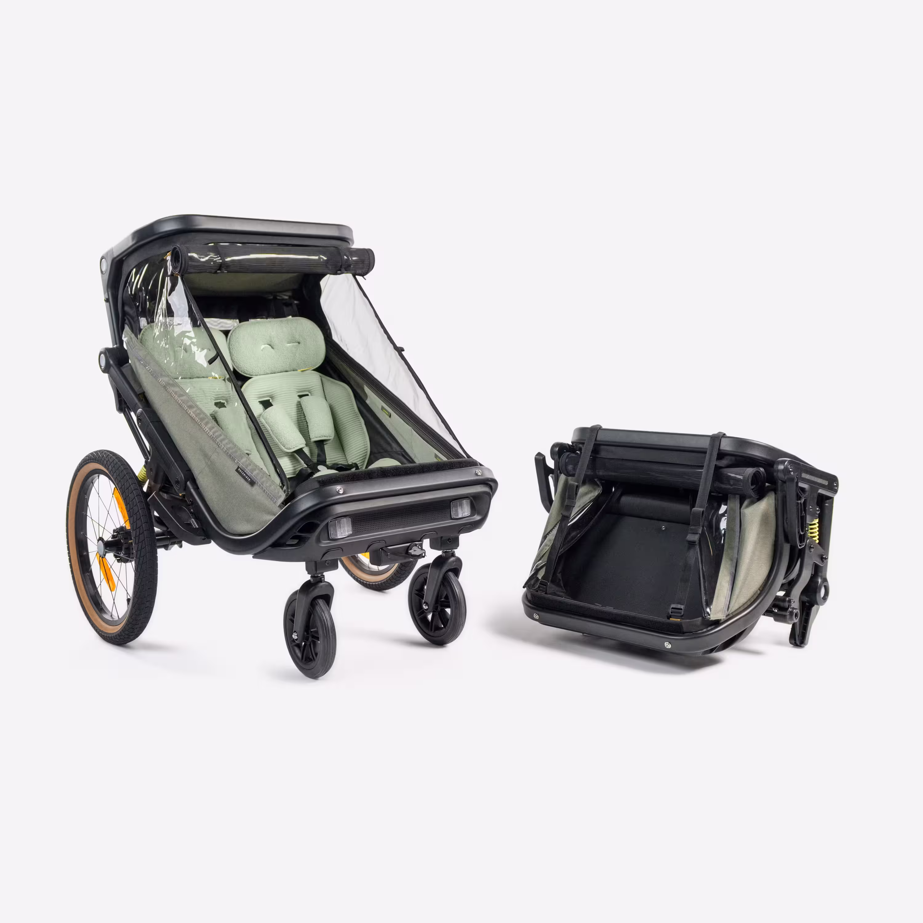 - Une modularité totale : Le passage du mode vélo au mode poussette se fait sans outils, avec des roues poussette et une barre de traction qui se rangent intelligemment.
